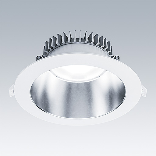 Et lavt, indbygget LED-downlight. Velegnet til loftsudskæringer Ø190-230 mm med henblik på nem istandsættelse eller hurtige førstemonteringer. Ekstern, tilkoblingsbar, DALI-dæmpbar LED-driver med DC-funktion, nødstrømsniveau forindstillet til 15 %, justerbar 1-100 %, NFC-konfigurerbar, kompatibel med SwitchDIM. Mulighed for sløjfning ind og ud. Armaturhus: plast til varmestyring. Afskærmning: polycarbonat, glat reflektor med en silkeblank finish med bred lyskegke. Reflektor og kant: højreflekterende polycarbonat af høj kvalitet. Isolationsklasse II, IP20. Fjederclips egner sig til lofttykkelser fra 1 til 35 mm. Komplet med 4000K LED