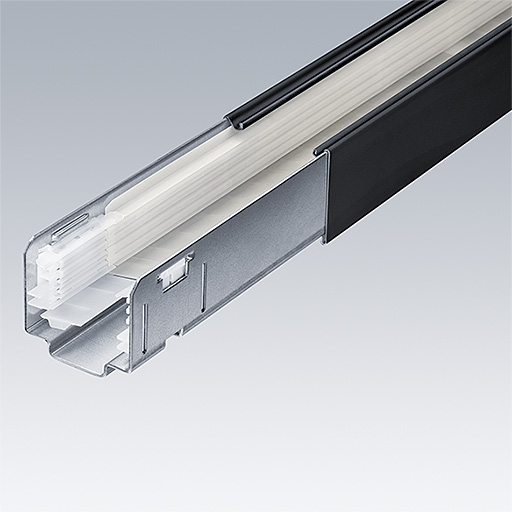 Skinnesystemer i profilvalset stål, der er pulverlakeret med sort polyesterlak. 5 strømledninger (5 x 2,5 mm²/16 A) plus 2 x 2 ledere (4 x 1,5 mm²/10 A) til integrering af nødbelysning ved hjælp af to individuelt isolerede kredsløb plus to styreledningsledere (2 x 1,5 mm²/10 A). Værktøjsfri sammenkobling ved hjælp at strømforsyningssæt.