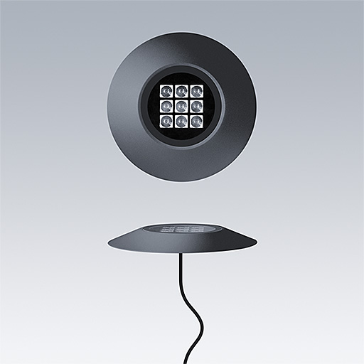 - Rundt armatur på jorden kan fåes i fire standardfarver (grå, antracit, sort, hvid). Og to størrelser (lille og medium).