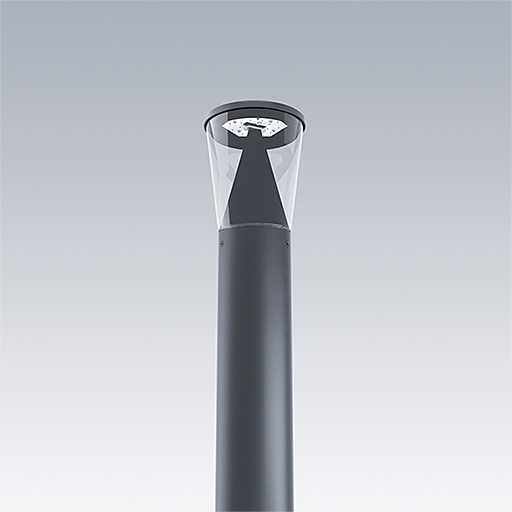 En diskret mastetoplanterne med 18 LED'er, der drives ved 250mA med Radial symmetrisk komfort lysfordeling. Uden dæmpefunktion LED-driver. Isolationsklasse II, IP66, IK10. Sokkel: trykstøbt aluminium (EN AC-44300). Finish: pulverlakeret aluminium, teksturiseret antracit (tæt på RAL7043). Sprederskærm: UV-stabiliseret klar polycarbonat. Forfortrådet med 3 m kabel Mast bestilles separat. Komplet med 3000K LED.