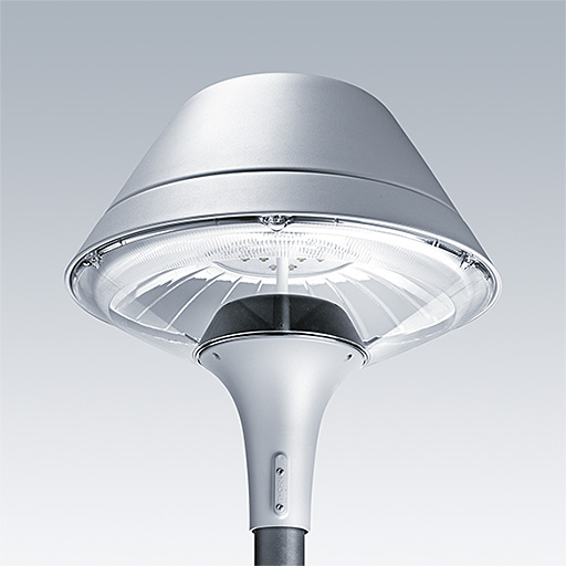 Dekorativt udendørs armatur til montering på mastetop med LED og elektronisk driver. Isolationsklasse II, kapslingsklasse IP66, IK08. Sokkel i støbt aluminium, pulverlakeret silver. Topskærm i O form af aluminium med finish i silver textur (tæt på RAL9006). UV-stabiliseret afskærmning i klar polycarbonat med prismer, bred gade-reflektor. Udstyret med 50% strømbesparelseskredsløb, der er i drift 3 timer før og 5 timer efter beregnet midnat. Det kan deaktiveres ved installation med en lettilgængelig intern knap. Leveres komplet i én emballage. Komplet med 4000K LED