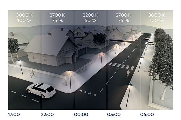 Le système NightTune ajuste automatiquement l’intensité lumineuse d’un luminaire, ainsi que sa température de couleur, en fonction de l’heure de la nuit et de la circulation.