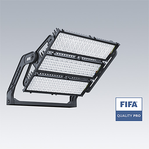 Projecteur LED haute puissance avec distribution lumineuse Optique 1 : faisceau étroit; Optique 2 : faisceau étroit; Optique 3 : faisceau étroit de 504 LED. Appareillage externe, Fourni uniquement par Thorn Lighting, à commander séparément (courant de transmission maximum 700 mA) et câblage via câble de type H07 RN-F et mini-diamètre de 13 mm. Classe électrique I, IP66, IK08. Dissipateur thermique : Moulage sous pression aluminium thermopoudré gris foncé (similaire à RAL 7043). Support de fixation et cadre : gris foncé (similaire à RAL 7043). Fermeture : 4 mm transparent verre. Fourche montée à l’aide des points de fixation disponibles (une vis M20 et deux vis M14). Fonctionnement à faibles papillotements (< 1 %) adapté à une diffusion TV haute définition. Livré avec LED 4 000 K