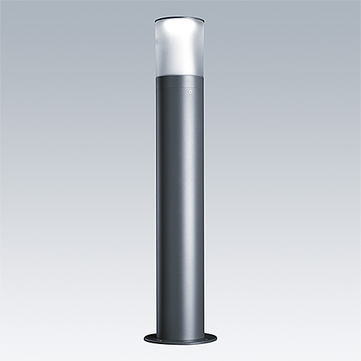 Borne LED intemporelle. Electronique, non gradable. Classe électrique II, IP65. Tête et corps : aluminium thermopoudré gris 900. Diffuseur : Polycarbonate (PC) anti-UV semi-opale. Montage sur semelle recevant 4 tiges de scellement. Livré avec LED 3 000 K