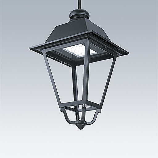 Lanterne de style 19e siècle avec 24 LED, courant commutable et optique Route étroite. Équipé d’un circuit de réduction de puissance, profil sélectionné par un interrupteur rotatif. Classe électrique II, IP66, IK08. Corps : aluminium Moulage sous pression, laqué noir (similaire à RAL9005) texturé. Boîtier : verre extra épais 4 mm,transparent. Livré avec LED 3 000 K