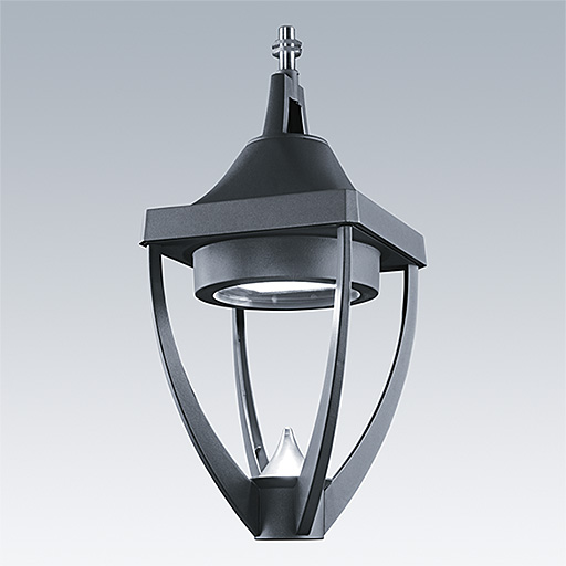Lanterne LED patrimoine moderne suspension avec optique fermée. Electronique. Classe électrique I, IP65, IK08. Corps : aluminium Moulage sous pression thermopoudré gris 900, finition texturé (close to RAL 7043). Boîtier : verre trempé plat. Protection contre les surtensions : 10 kV en mode commun single pulse et 8 kV en mode commun multipulse; 6 kV en mode différentiel multipulse. Si un système DALI est connecté: 6 kV en mode mode commun et mode différentiel multipulse. Livré avec LED 4 000 K.