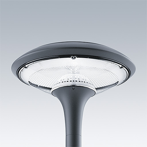 Plurio Indirect : Lanterne LED décorative à montage top avec distribution Radialement symétrique. Driver avec 24 LED entraînés à 700mA. Classe électrique I, IP66, IK08. Base : coulé aluminium, thermopoudré gris anthracite 900 sablé. Chapeau : forme disque, aluminium, texturé gris anthracite 900 sablé. Diffuseur : anti-UV, transparent Polycarbonate (PC) avec prismes anti-éblouissement. Optique à réflecteur indirect Livré avec LED blanc variable 2 200 - 4 000 K. Montage top sur mât de Ø 60mm.